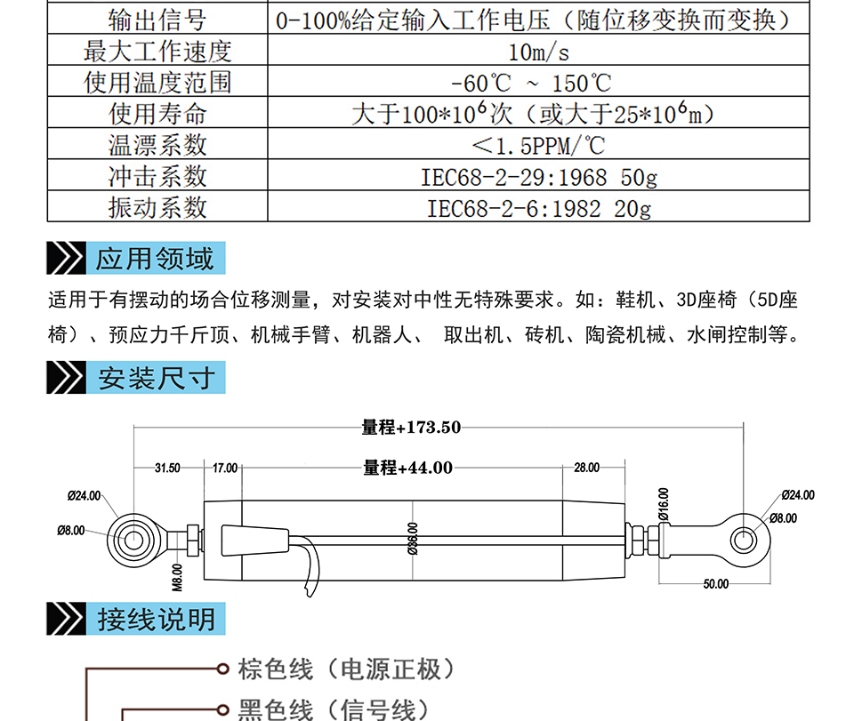 主要應用領域:KPC絞接式直線位移傳感器,兩端魚眼萬向節(jié)絞接,適用于有擺動的場合位移測量,對安裝對中性無特殊要求。如:鞋機、3D座椅(5D座椅)、預應力千斤頂、機械手臂、機器人、 取出機、磚機、陶瓷機械、水閘控制等。